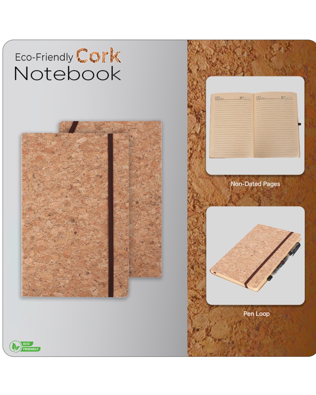 - Eco-friendly cork cover with a premium natural finish