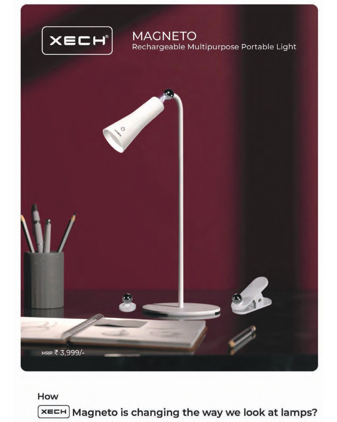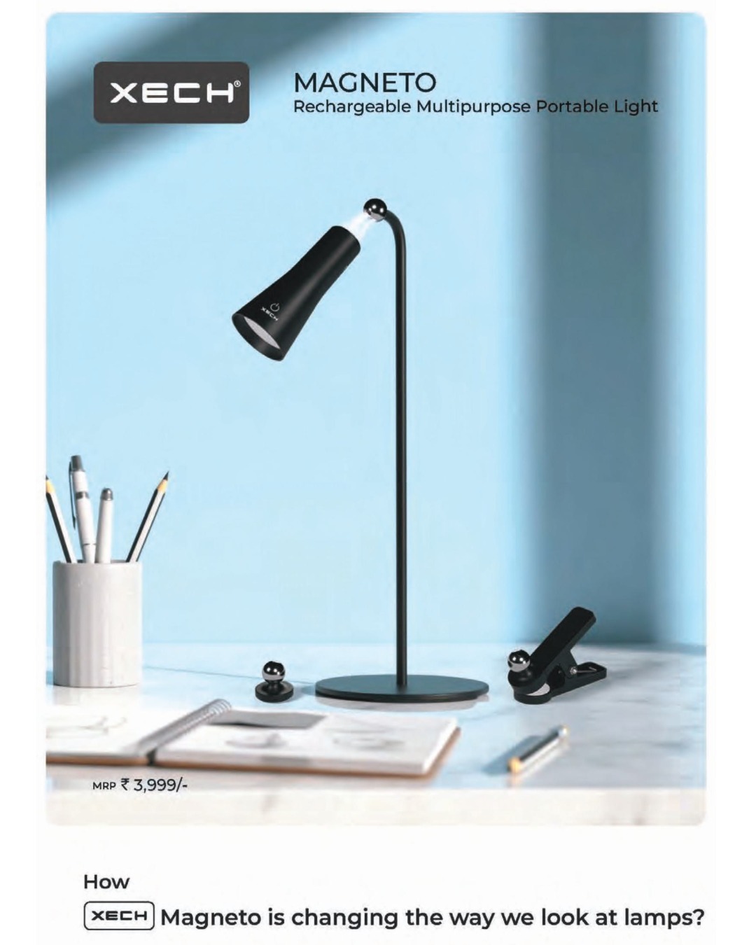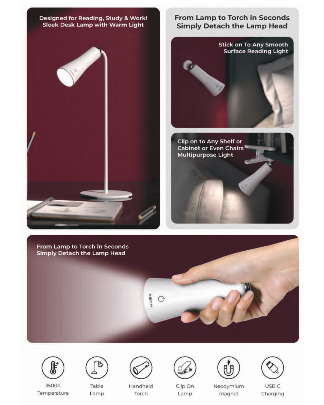 - 4-in-1 Multifunctional Lamp: Table lamp, handheld flashlight, clip-on reading light, and stick-on spotlight.