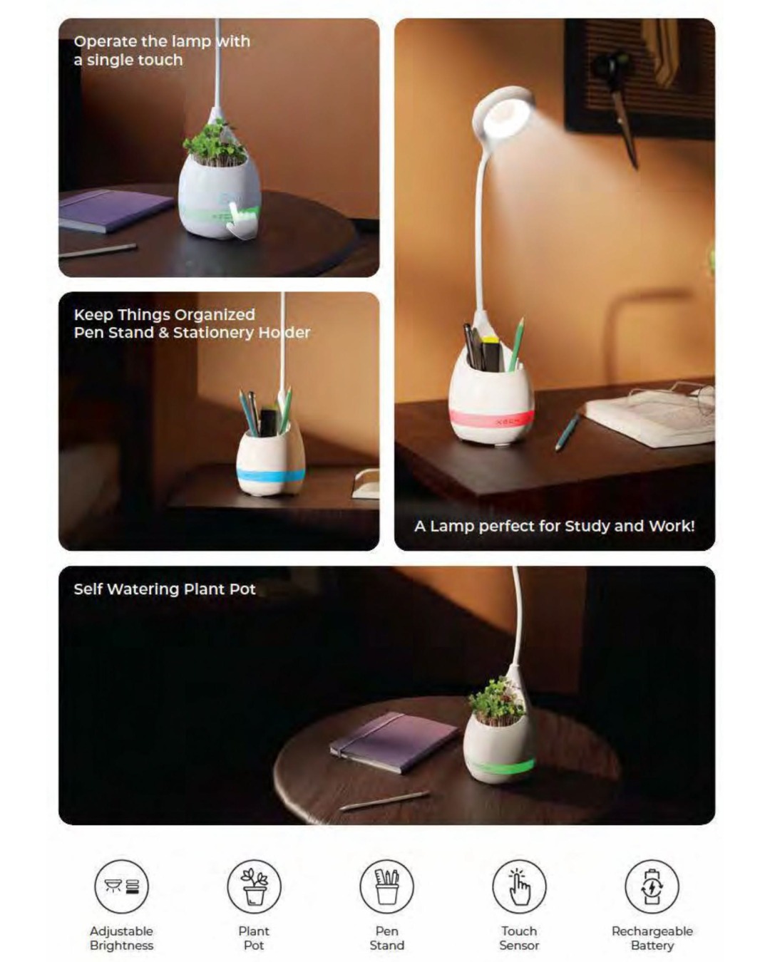 - Multi-Functional Design: Desk lamp with pen stand and small plant holder.